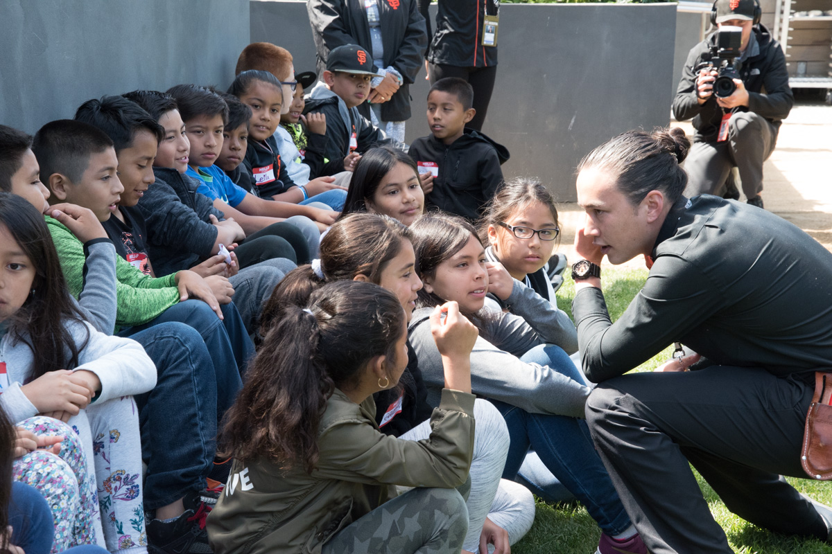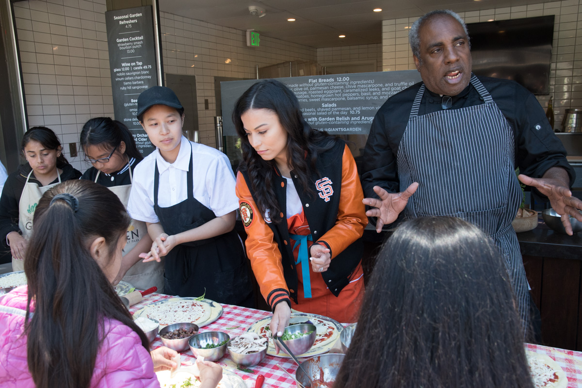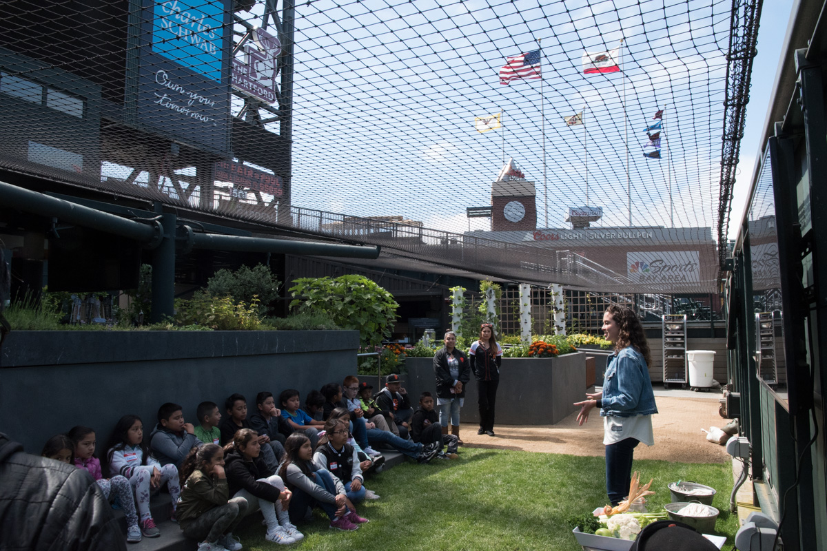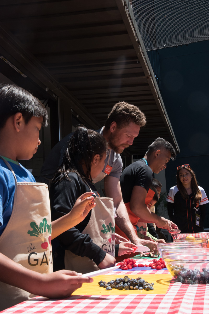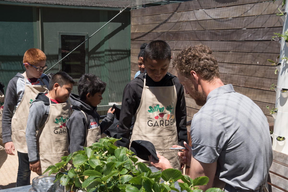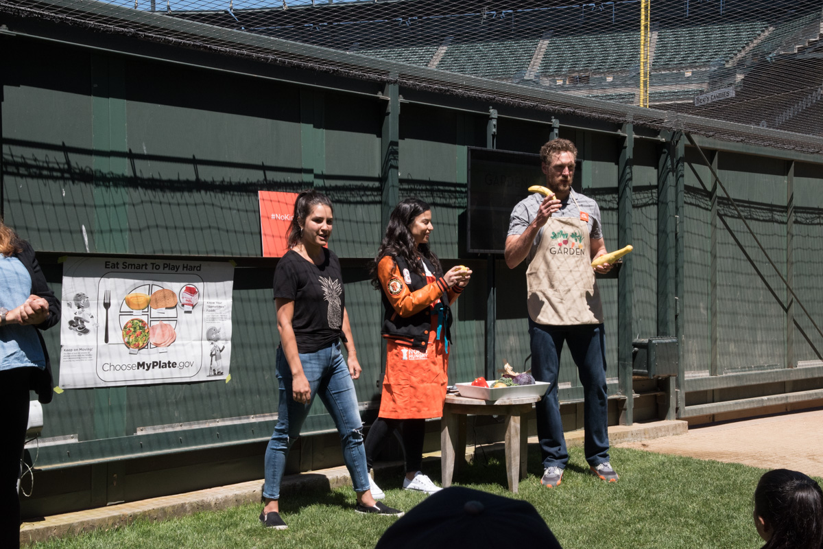 About 20 third- to fifth-graders from Marshall Elementary joined Garden at AT&T Park Program Manager Sam Wilder in a hands-on lessons in edible plant parts, followed by a garden scavenger hunt for key ingredients and a nutrition discussion with educators from 18 Reasons’ nutrition education program, Cooking Matters, and Hunter and Alexis about how healthy food helps you play as hard as you can.