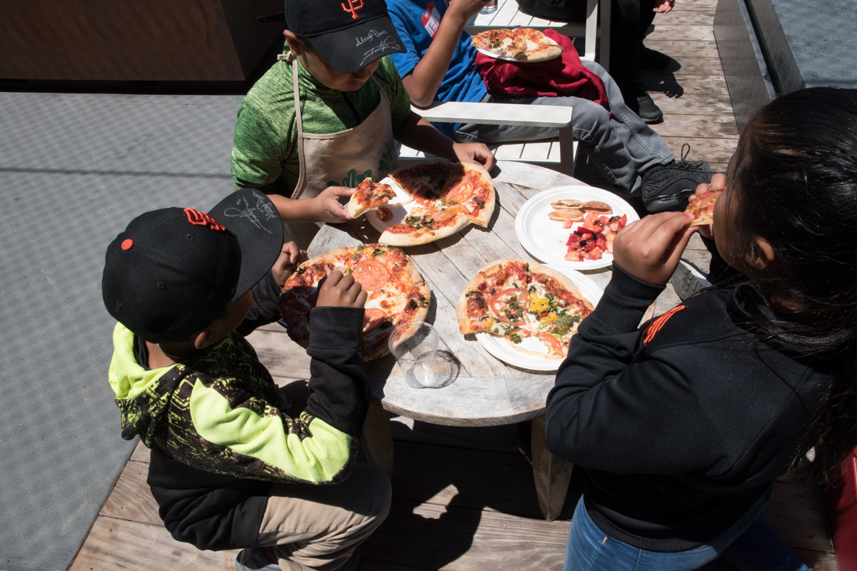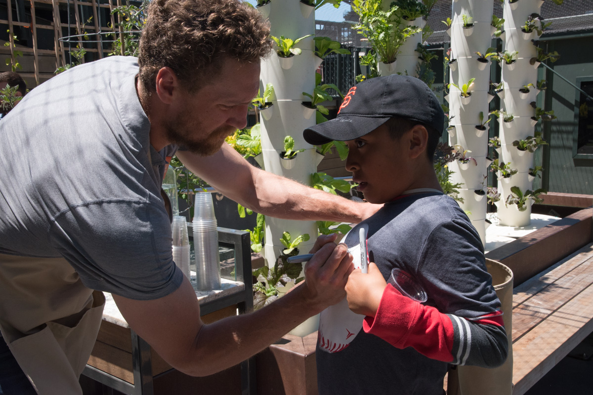The Pences joined Bay Area culinary talents Bon Appétit’s Executive Chef of Concessions at AT&T Park, Toussaint Potter, and Chef Thomas Weibull of Dirty Habit for an interactive cooking experience that taught the kids how to prepare vegetable pizzas with garden-fresh ingredients — including Hunter’s favorite, kale! — and rainbow fruit salad with peaches, strawberries, blueberries, and more. While the pizzas were cooking, Hunter signed special Giants baseball hats for all the kids.